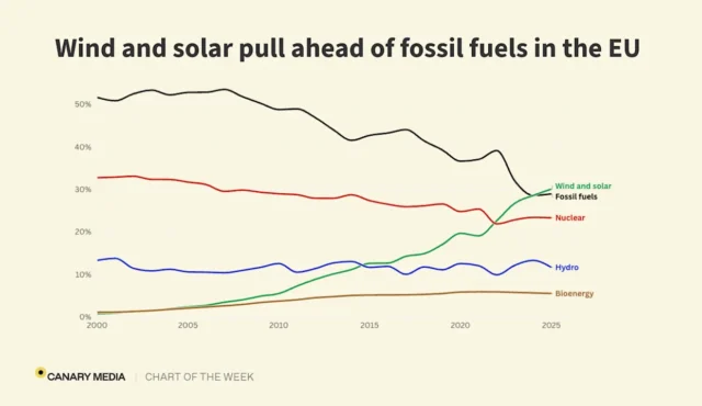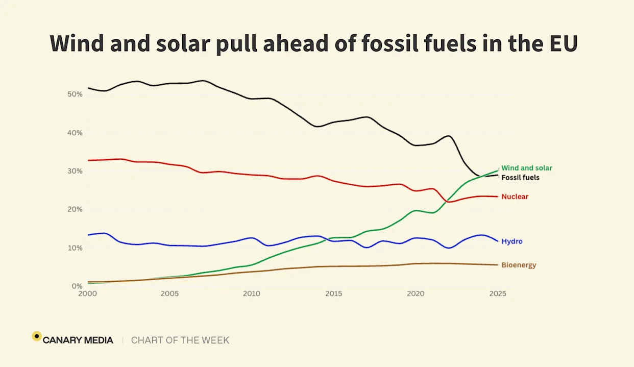 Если в 2015 году чуть менее 13% электричества в ЕС было выработано с помощью ветряных турбин и солнечных панелей, при этом на углеводородные источники приходилось почти 43% потребления электроэнергии (из которых уголь составлял примерно четверть), то в 2025 году ситуация изменилась. Доля ископаемых источников упала ниже 29%, а возобновляемые источники выросли выше 30%.